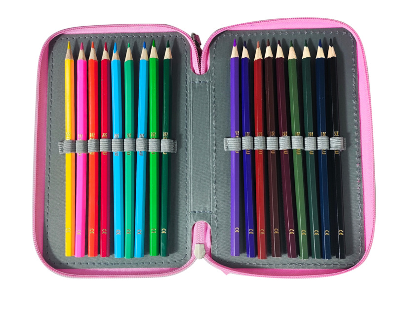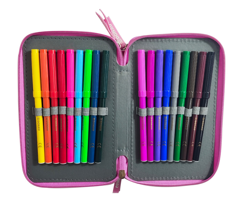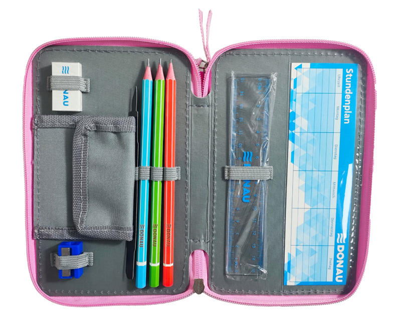 - 43 pieces (1 eraser, 1 sharpener, 3 pencils, 1 ruler, 1 timetable, 18 fiber-tip pens, 18 colored pencils)