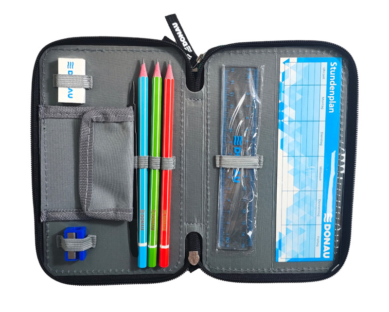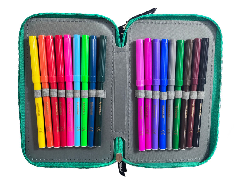 • 43 pieces (1 eraser, 1 sharpener, 3 pencils, 1 ruler, 1 timetable, 18 fiber-tip pens, 18 colored pencils)