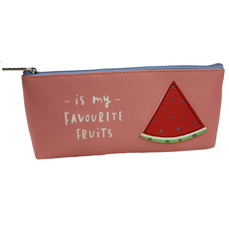 mit einem Zipper, in 3 Pastell-Farben sortiert (lila, rosa, mint), mit aufgenähten Früchten und aufgedrucktem Spruch (is my FAVOURITE … FRUITS), Größe BxHxT: 21 x 9 x 3 cm