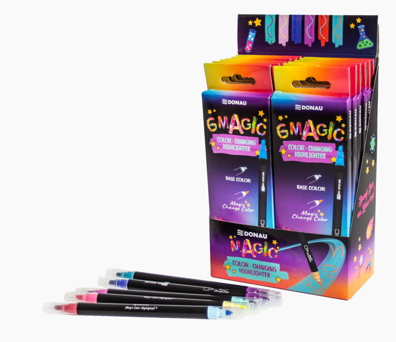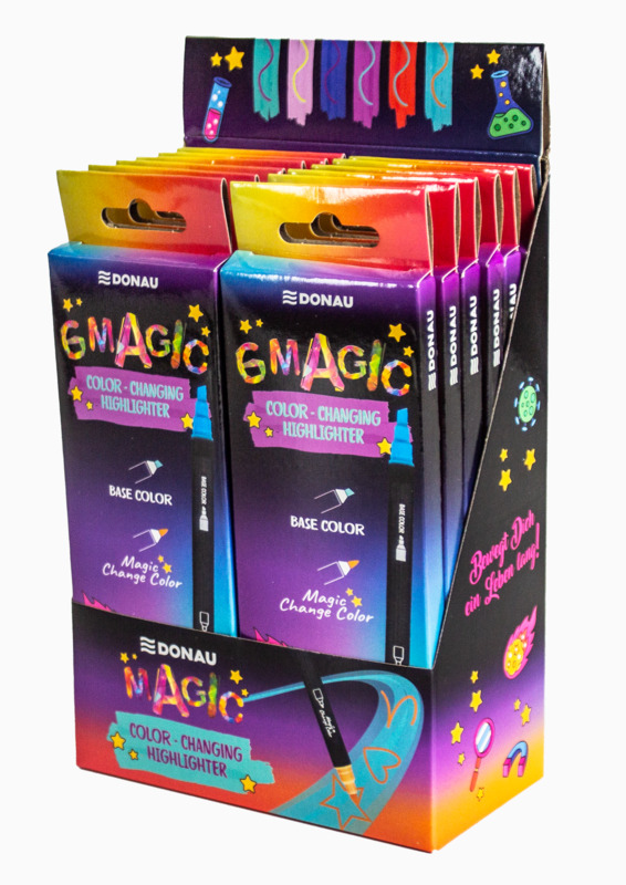 - doppelseitiger Textmarker mit Keilspitze (Grundfarbe) und runder Spitze (Magic Color).