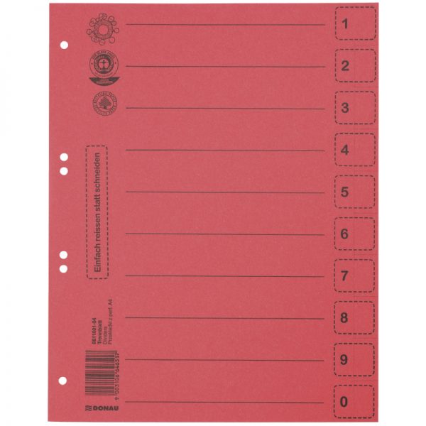 Trennblatt mit 10 mikroperforierten Taben für die individuelle Gestaltung. Raus Reiß Taben – einfach umknicken, sauber abreißen – keine Schere nötig. Format BxH: 235 x 300 mm für Papierformat DIN A4. Aus Recyclingkarton 250 g/m², mit 4-fach Lochung und schwarzem Linienaufdruck. Zertifiziert mit dem Österreichischen Umweltzeichen und Blauer Engel.