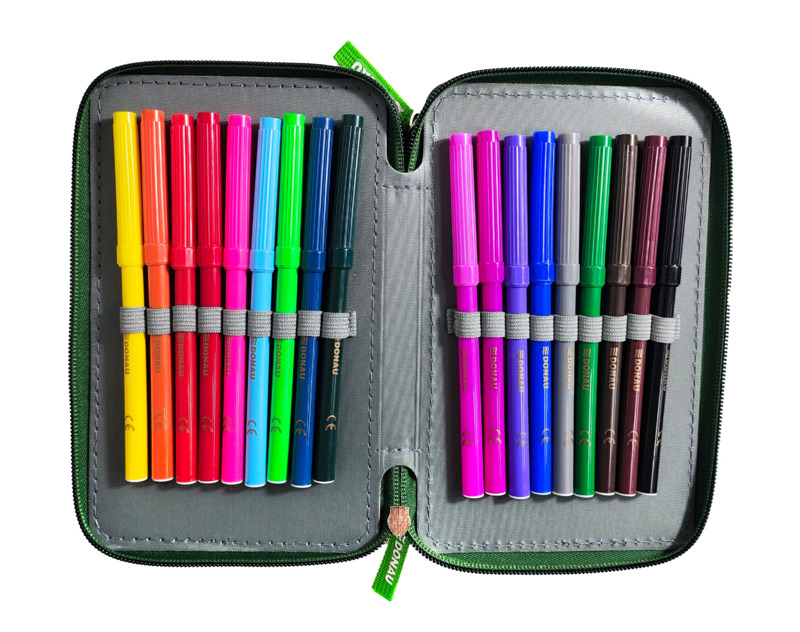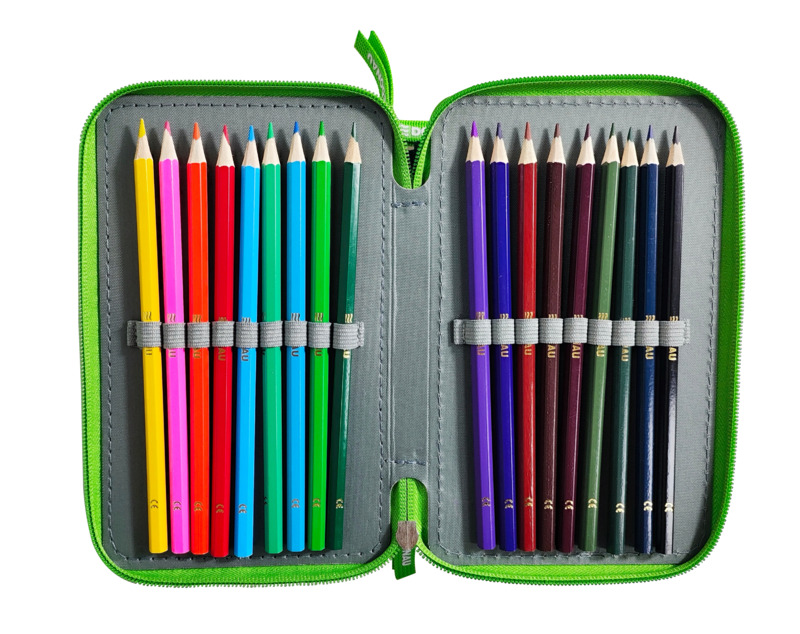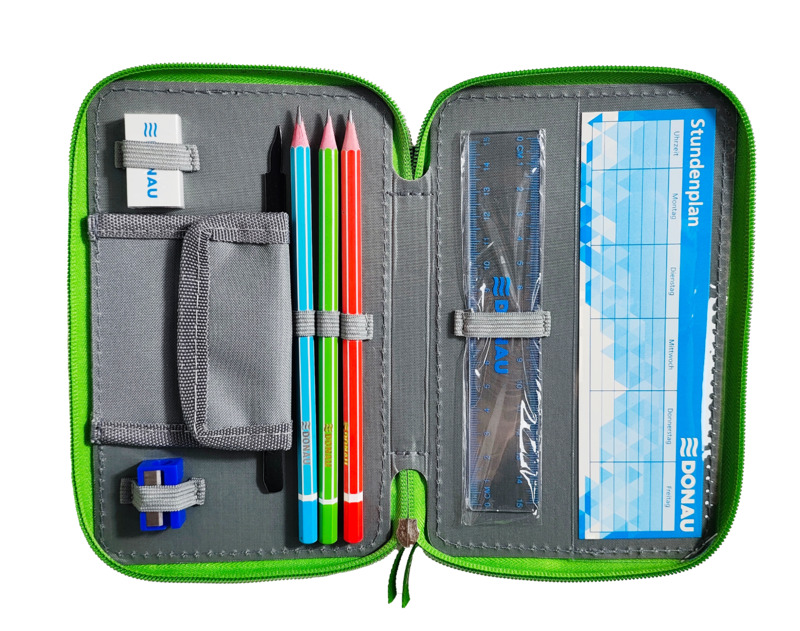 • 43-teilig (1 Radierer, 1 Spitzer, 3 Bleistifte, 1 Lineal, 1 Stundenplan, 18 Fasermaler, 18 Farbstifte)
